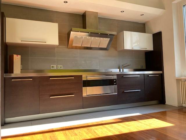 - cucina di design in rovere tinta grigia con elettrodomestici Rex/Smeg e piano in acciaio in un pezzo unico di 4 mt con lavelli e trita rifiuti integrato. Frigorifero libera installazione in acciaio. Ampia dispensa a tre ante in vetro/rovere per deposito vivande.